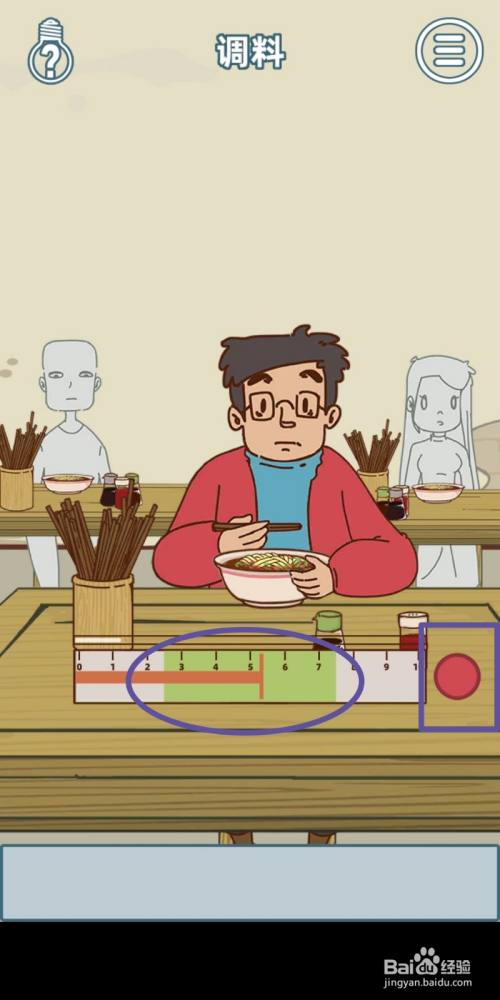 当进度条处在绿色区域时,点击按下红色按钮,就可以给男本家儿倒出适量酱料。。