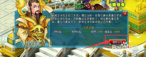 进入游戏后,点击玉帝接本家儿线,玉帝说泾河龙王犯了天规,理因当斩,他说唐王李宿世民说要保他的人命,可有被魏征在梦里杀了,这下要找唐王报仇,李宿世民说真命皇帝,您快去庇护他。
