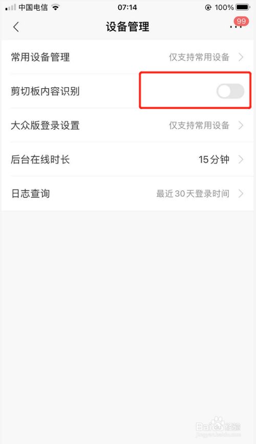 最后,在设备办理页面里,将剪切板内容识别右侧的按钮封闭,即可当作功在招商银行app封闭剪剪切板内容识别功能了,如下图。