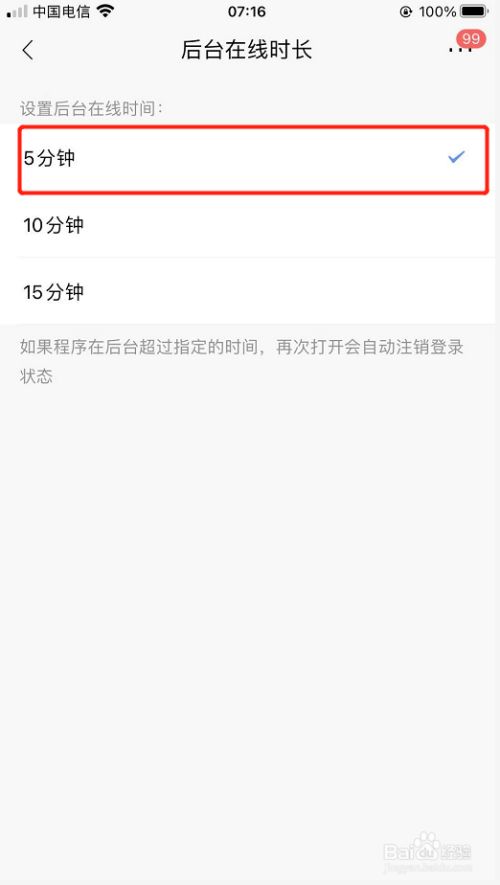 最后,在后台在线时长页面里,勾选想要设置的时长即可当作功在招商银行app,设置后台在线时长了,如下图。