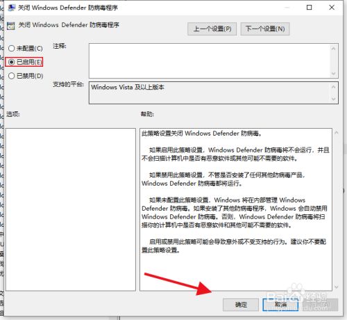 Windows Defender 防病毒程序编纂界面,点击封闭Windows Defender 防病毒程序的选项。