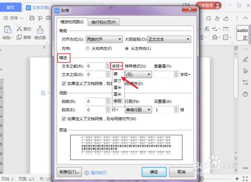 在段落窗口,在缩进下方,点击“字符”,设置为“磅”。