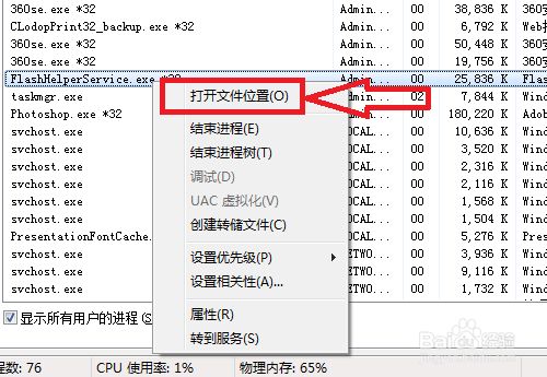 打开使命办理器后,在【历程】里找到FlashHelperService.exe