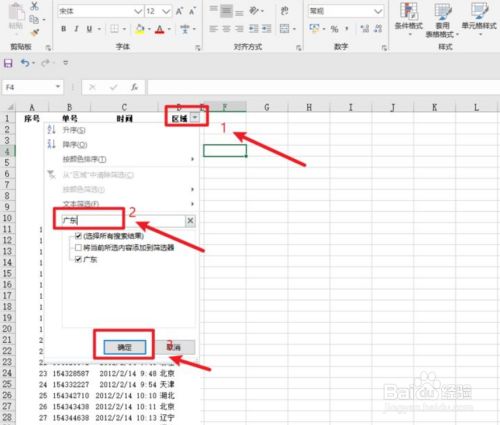 点击在筛选下拉框中按钮,在文本筛选中输入需要删除的文字行,如“广东”,点击“确定”。