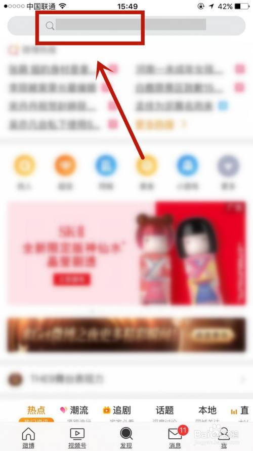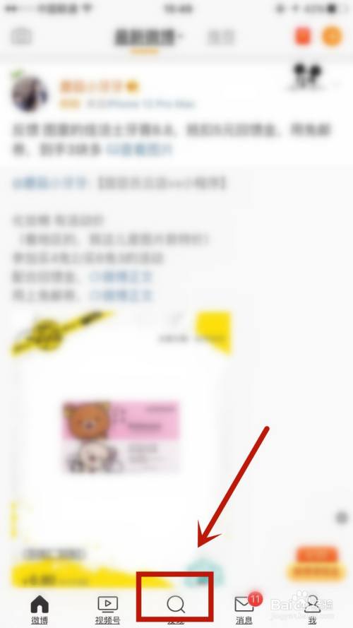 1.打开微博,点击下方的发现进入页面最上方的输入框。