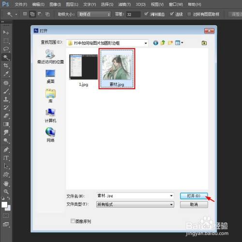 第二步:在打开对话框中,选中一张需要加圆形边框的图片并打开。