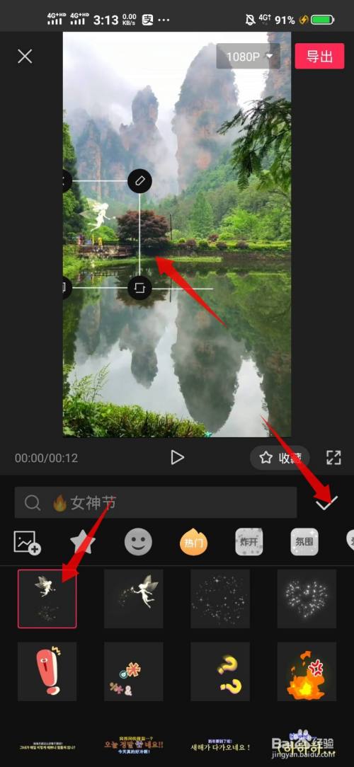 选中一个仙女的贴纸,点击对号,拉动仙女贴纸到视频的左边。