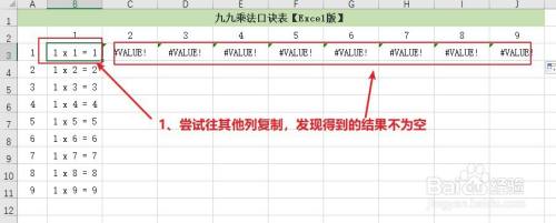 将B列的单位格公式复制到其他列,最后就获得了所需要的九九乘法口诀表。