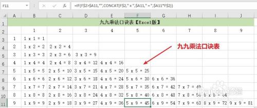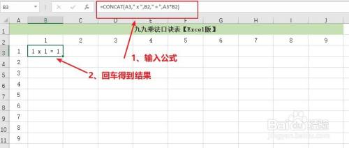 B3单位格要展示的是“1 x 1 = 1”,输入公式“CONCAT(B$2," x",$A3," =",$A3*B$2)”回车即可获得成果。