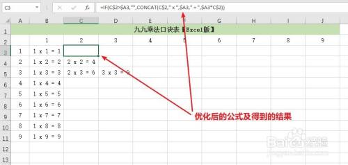 优化后的公式为:=IF(B$2>$A4,"",CONCAT(B$2," x",$A4," =",$A4*B$2))