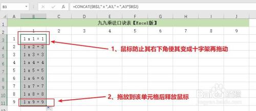 选择B3单位格,将鼠标移至右下角使其酿成十字架,按住鼠标往下拖到B11释放,获得九九乘法口诀第一列成果。