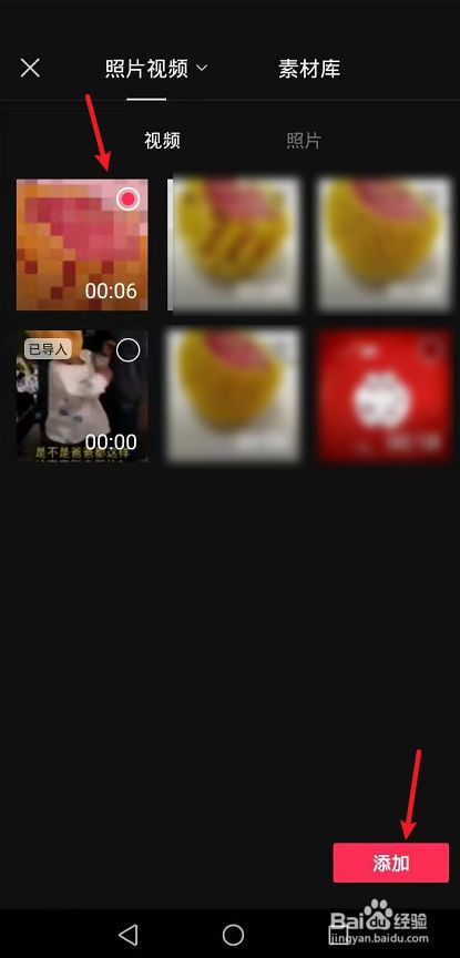 进入手机相册,点击一个视频,再点击“添加”。