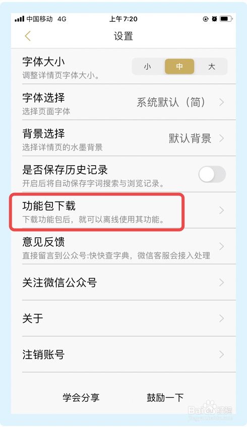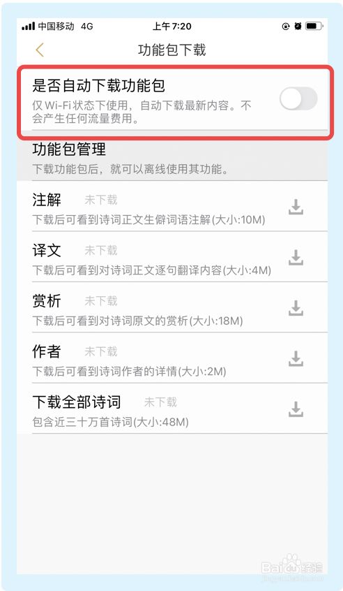 5.在接下来的界面,点击【是否主动下载功能包】选项,完当作以上步调古诗辞书app即可封闭是否主动下载功能包功能。