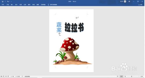 第一步,首先点击打开“WORD”文档软件 ,输入题目文字内容:拉拉书。设置字体样式为艺术字体本家儿题色5,文本结果设置为“弯曲下翘”。