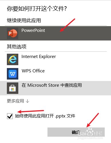 选择PowerPoint,勾选利用利用此应用打开.pptx文件,点击确定。