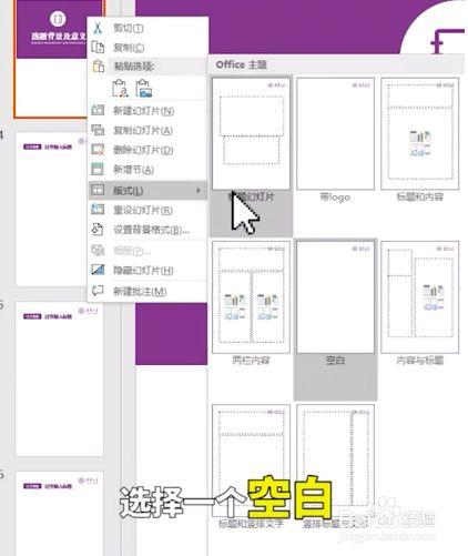 四、若是您的此中一页不想要logo,我们可以在视图傍边来到幻灯片母版,我们来到最后可以右键插入幻灯片母版,再封闭母版视图,右键在版式傍边选择一个空白,这一页就没有logo了。