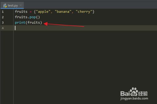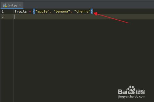 在python文件编纂区中,利用大括号界说一个“fruits”调集对象。