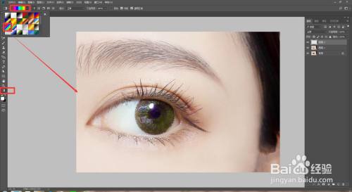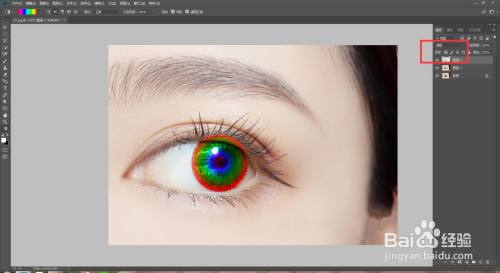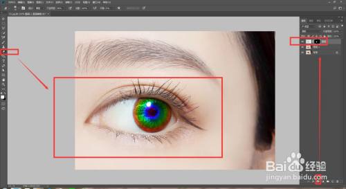 也可以新建一个图层,点击椭圆东西在眼睛上绘制一个椭圆,点击渐变东西,选择渐变,在椭圆上拉一个渐变。