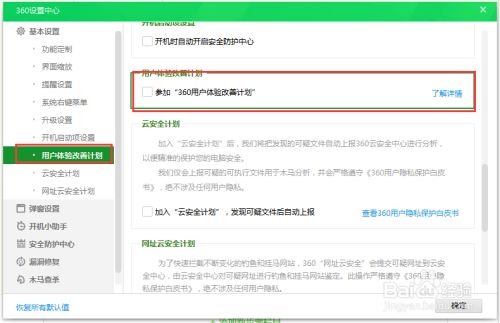然后点击用户体验改善打算,然后将加入360用户体验改善打算打消勾选一下。