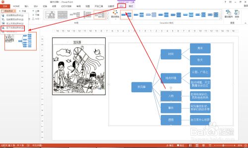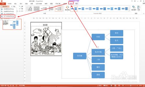 输入题目:放风筝——点击设计——添加外形——鄙人方添加外形,添加六个二级分支,并别离输入:时候、地址情况、人物、事务、感悟。