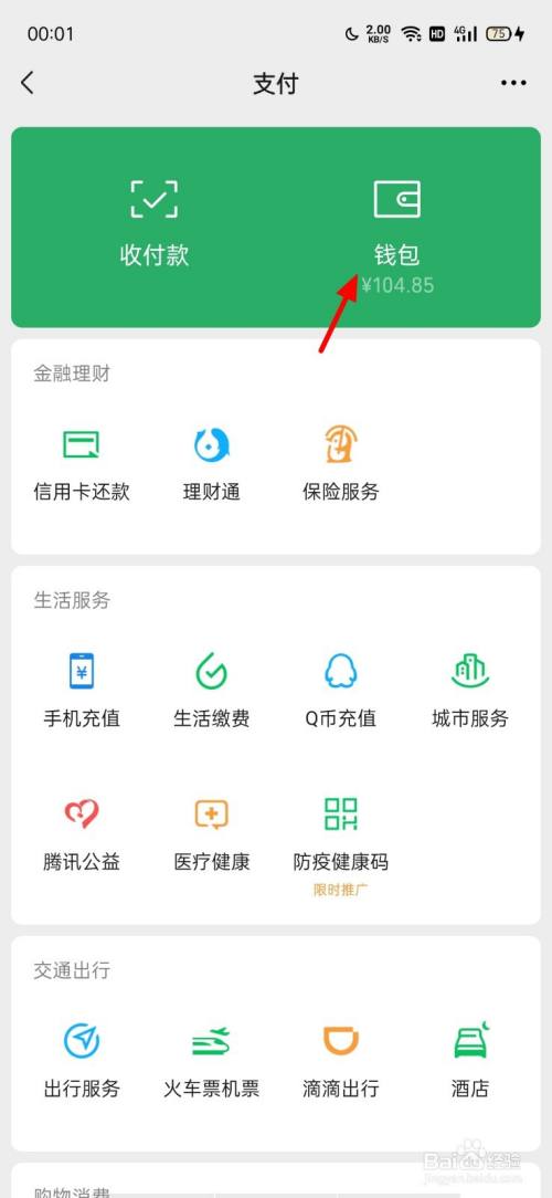 在支付页面,点击 钱包;