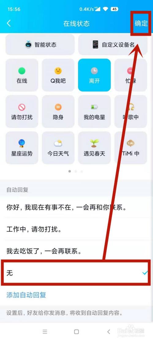 3.勾选上无后点击右上角简直定,当上方栏显示状况切换当作功的字样,就代表分开状况下也不会主动发信息给别人了。