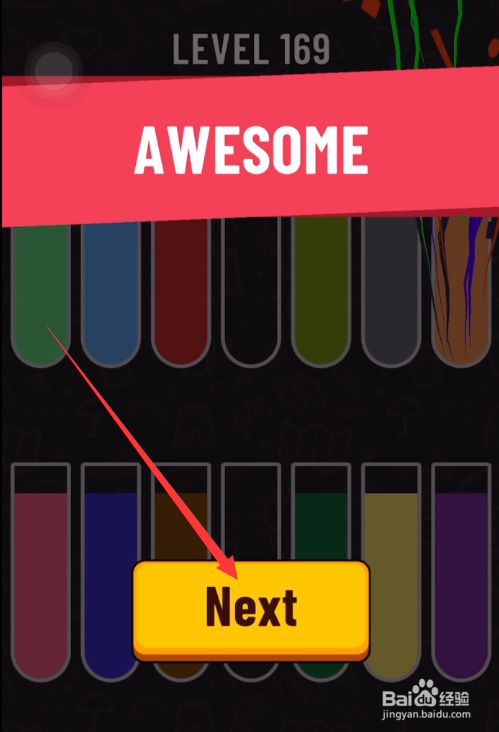 - 依次将所有颜色分类到零丁的试管中完当作关卡,点击【NEXT】继续下一关。