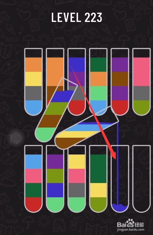 打开游戏进入223关,如图所示首先将所有头层深蓝色液体倒入一只空的试管中。