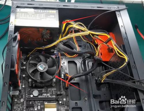 依次在机箱安装:电源、CPU及电扇、内存条。