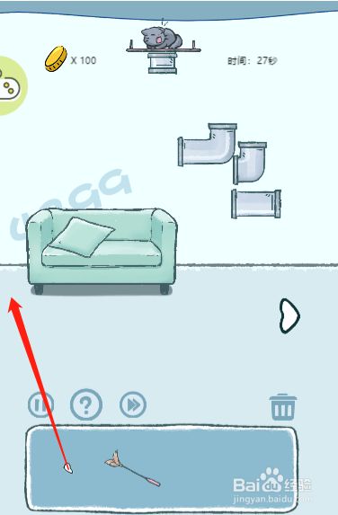 工具/原料联想小新13windows10方式/步骤1首先我们在右边的场景的垃圾桶里面拿到箭头2然后打开图中的柜子拿到里面的逗猫棒3接着把箭头放置到图示的位置4这样子我们就可以拿到左边场景的木板了5接着把管道调整好而且将木板补在空白的位置上面6然后将沙发上面的抱枕放到图示的位置上面去67最后再利用逗猫棒挑逗小猫咪,这样子小猫咪就可以在不受伤的环境下下来了END