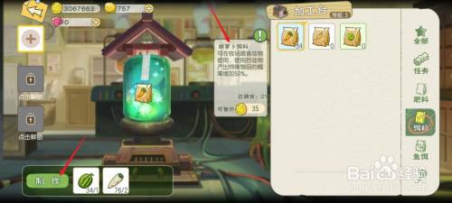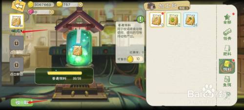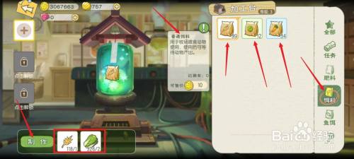 点击右侧的【饲料】选项,再点击左下角的【建造】按钮。有三种饲料可以建造。