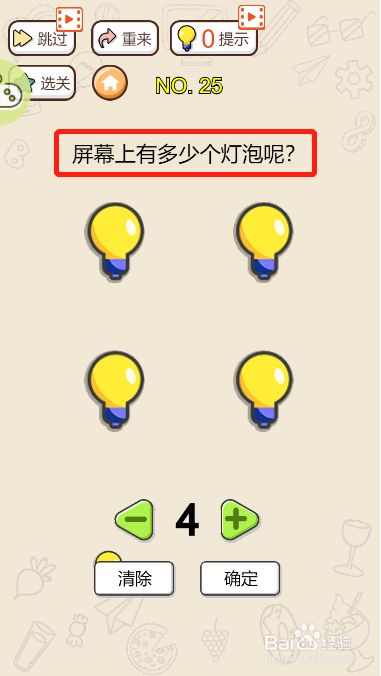 工具/原料联想小新13windows10方式/步骤1首先看一下第二十五关的要求“要求我们找一下有几多灯胆”2然后看一下下方的场景3直不雅看上去一共有四个灯胆,测验考试看一下是否可以移动34移动一起头的四个灯胆之后会发现四个埋没的灯胆5再加上断根按钮哪里有一个小灯胆,就是九个灯胆6再算上提醒按钮哪里的小灯胆一共是十个7输入我们的谜底而且点击【确定】锁定成果即可过关END