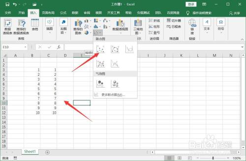 打开excel,输出两列数据,点击【插入】-【图表】,选择一种图表,例如散点图。