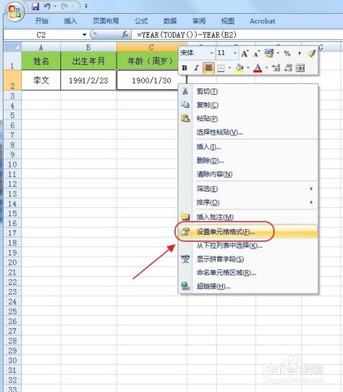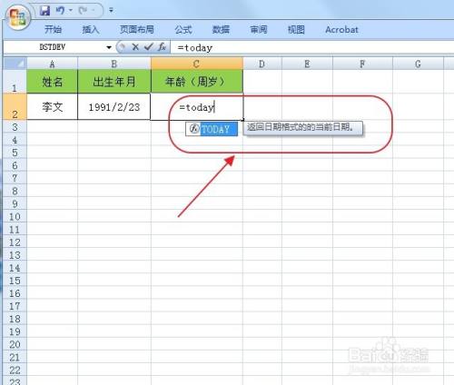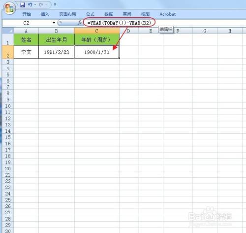我们在C2单位格内输入完整的函数表达式,“=YEAR(TODAY())-YEAR(B2)”,意思为用本年的年份减去出生日期的年份,但发现成果仍然为日期,单位格格局设置呈现了问题。