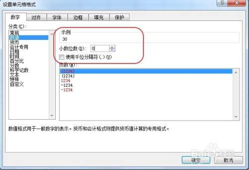 随后弹出“设置单位格格局”窗口,选择“数字”下的“数值”选项,然后在“小数位数”中设置为“0”即可。