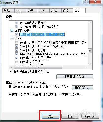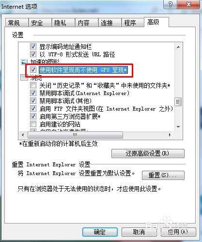 3、在高级标签页中下拉设置列表,将“利用软件呈现而不合用GPU呈现”打勾。