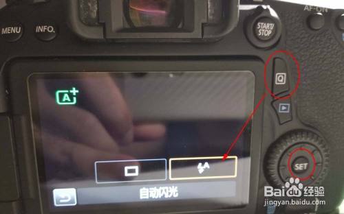按【右偏向键】选中【封闭闪光】的图标,点击【SET】确定。