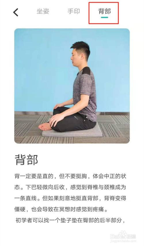 5、“背部”一栏中,则介绍了正念冥想时背部应该连结什么样的姿势。