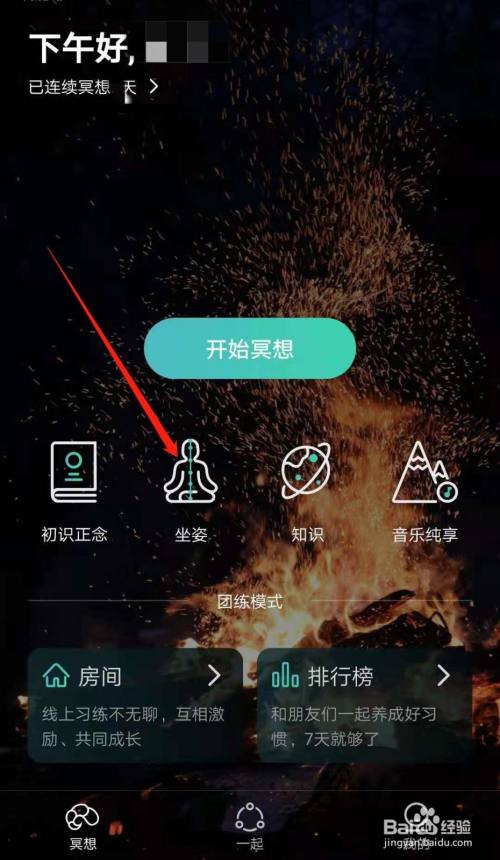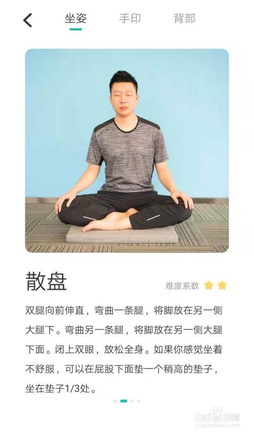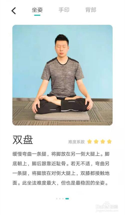 3、此刻,可以起头进修正念冥想的坐姿了。在“坐姿”一栏下,有四种正念冥想坐姿的具体介绍,可以经由过程标的目的右滑动屏幕来查看更多的坐姿介绍。