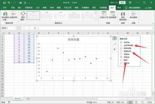 以散点图为例,点击图表右上角加号,添加坐标轴题目、数据标签、图例等。