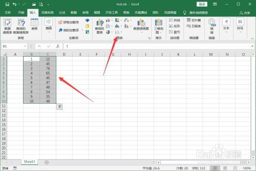 打开xls表格,输入数据并选中,点击【插入】-【图表】。