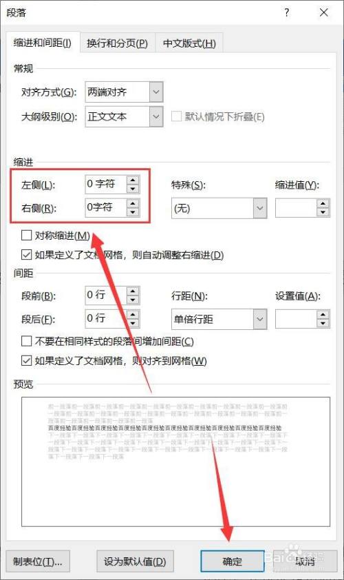 在段落设置中将摆布缩进值设置为0,点击【确定】。