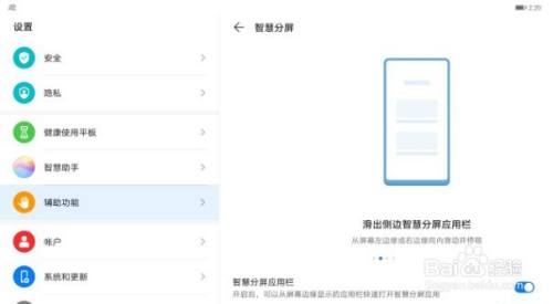4、聪明分屏开关默认开启。利用前,请进入设置-辅助功能-聪明分屏,查看是否开启。