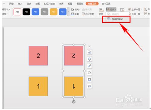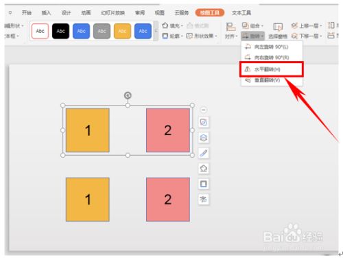 那么若是我们想要进行上下图形交换呢,这时我们需要反复上述组合的操作步调,将上下的1和2组合当作一个图形,然后再单击东西栏中的画图东西下的扭转,下拉菜单里选择垂直翻转。