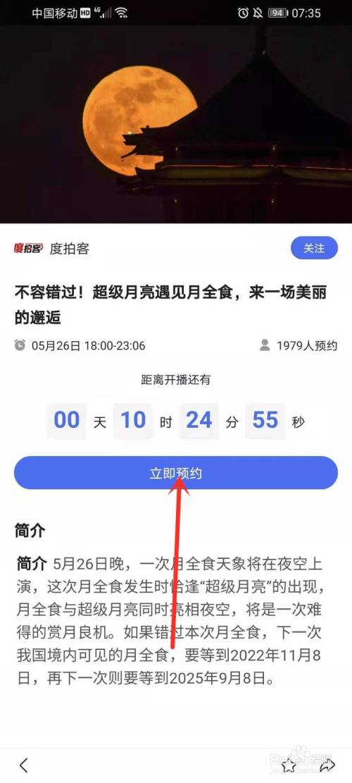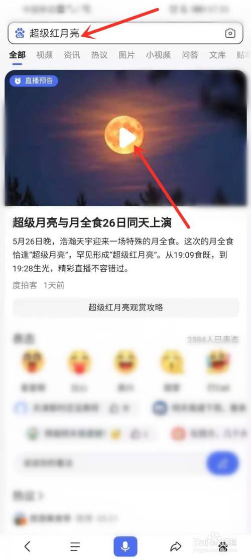 百度搜刮“超等红月亮”,然后在搜刮成果的顶部即可看到直播预告,点击进入预约界面。