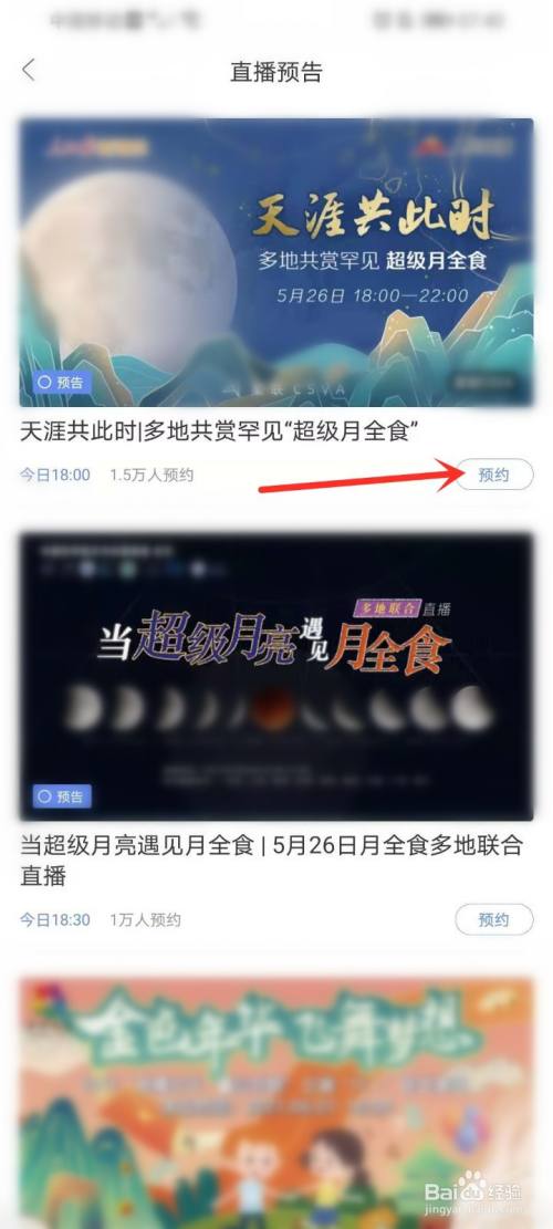 在直播预告列表中找到“超等月全食”,点击下面的【预约】即可。