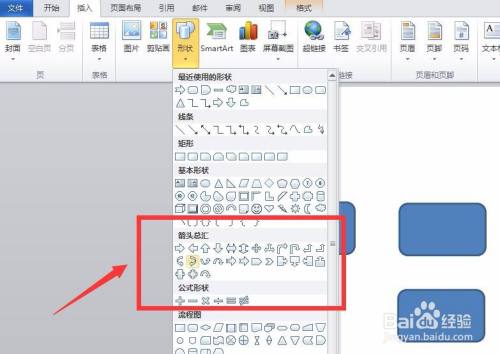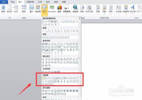 如下图所示,我们在外形中找到下图框选的【流程图】,选择本身需要的外形插入到文档中。