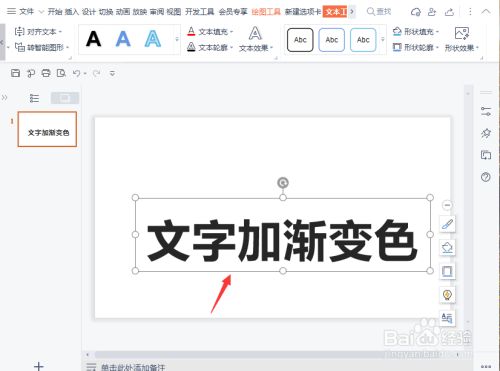 我们选择文本框里面的文字,点击【文本填充】,然后渐变填充的下面选择本身喜好的渐变颜色,好比:橙红色-褐色渐变,如图所示。