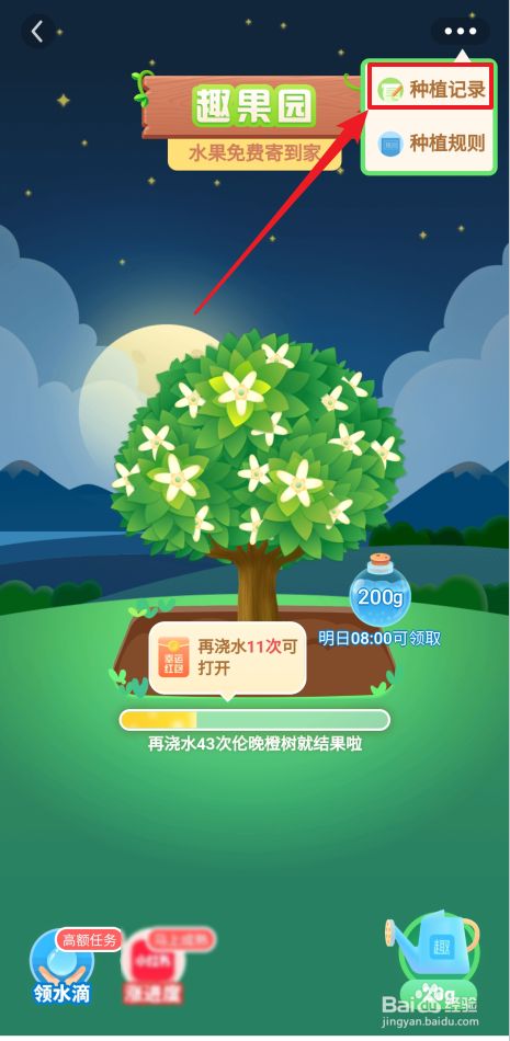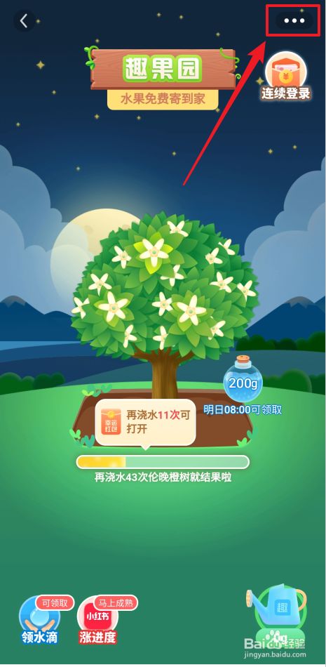 进入“趣果园”后,点击右上角三人小点图标按钮。见下图