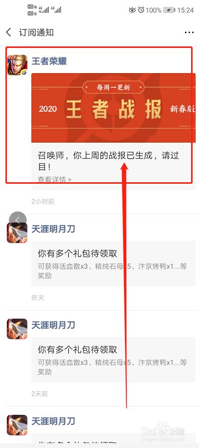 在“订阅通知”里面就有王者荣耀发过来的每周王者战报;